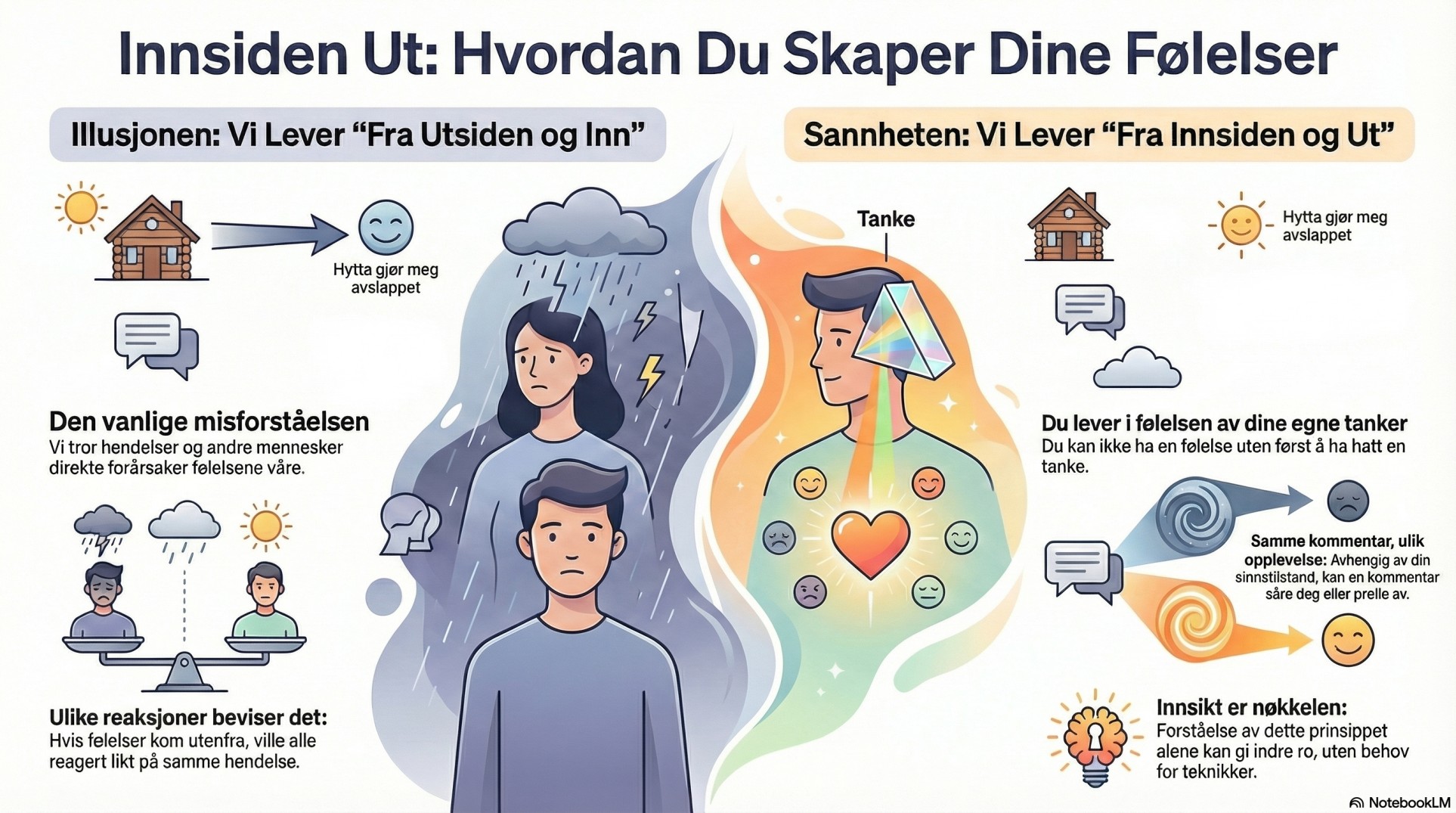 Da faller vi til ro igjen. Helt uten teknikker, metoder eller verktøy for å "fikse" opplevelsen – men kun gjennom en forståelse av at vi selv skaper vår virkelighet gjennom tanker.