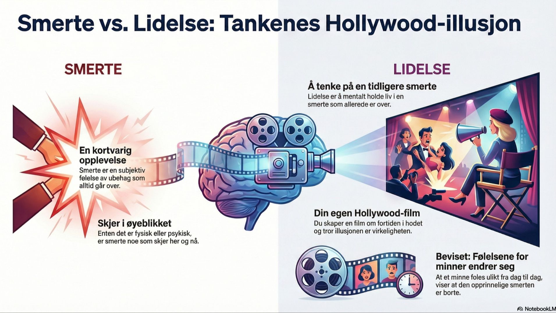 Smerte skjer i øyeblikket. Lidelse skjer når du henter frem minnet om smerten og gjenopplever den gang på gang. Når du ikke tenker på en tidligere smerte, har den ingen effekt på deg. Ergo: ingen lidelse.