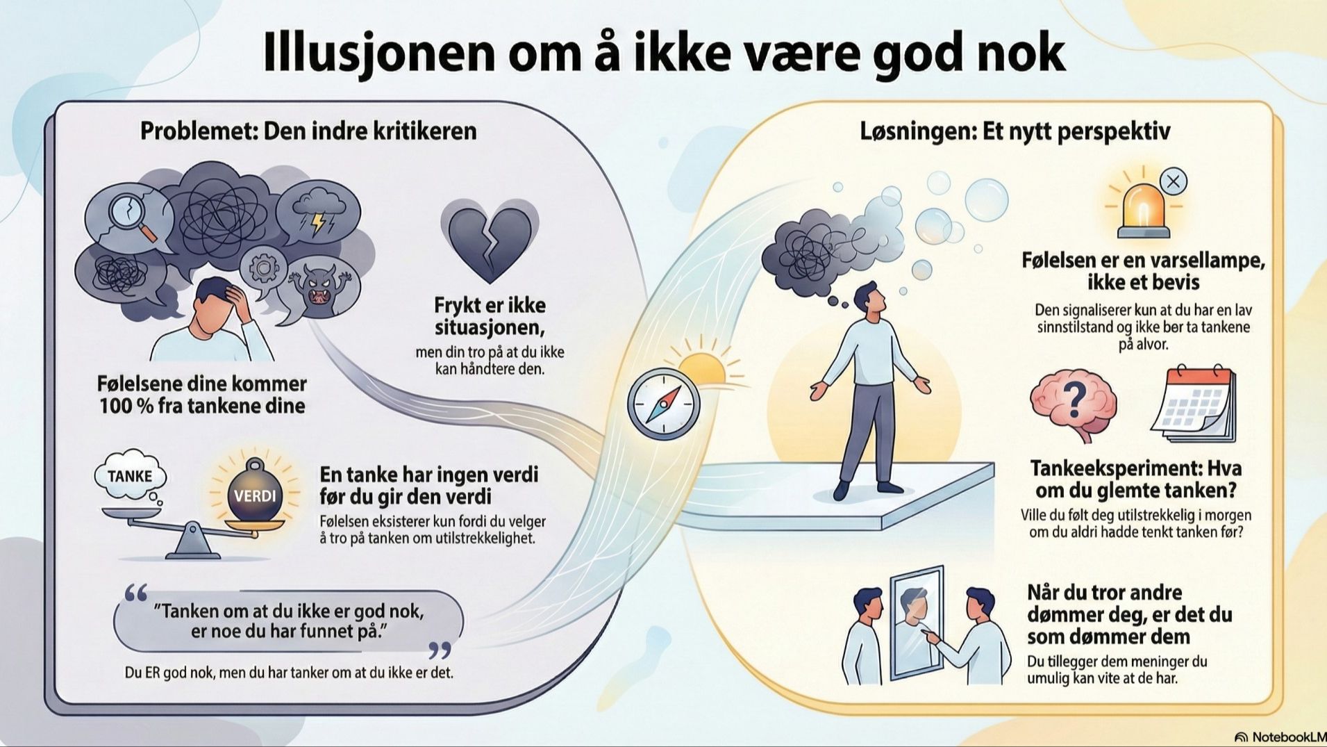 Det er ikke tankene i seg selv som er problemet. En tanke har ingen verdi før du gir den verdi. Følelsen av å ikke være god nok eksisterer kun fordi du tror på tanken om at du ikke er det.