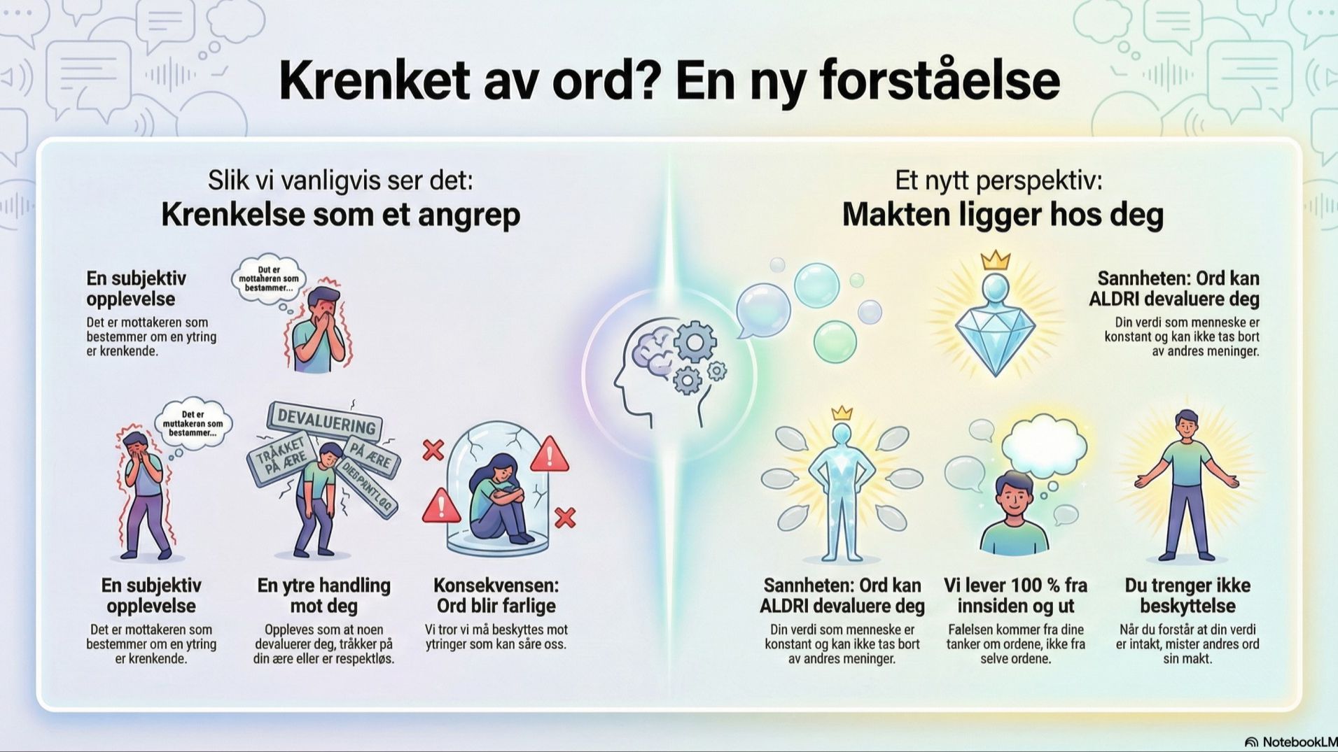 Ingenting er galt med deg Den vonde følelsen av å være krenket kommer ikke fra personen som sa noe dumt. Den kommer fra din tolkning og dine tanker i øyeblikket. Når du forstår at din verdi er intakt, uansett hva noen sier, mister ordene sin makt. Du trenger ikke beskyttelse fra ytringer, for du vet at de bare er andres meninger, ikke en definisjon av hvem du er.