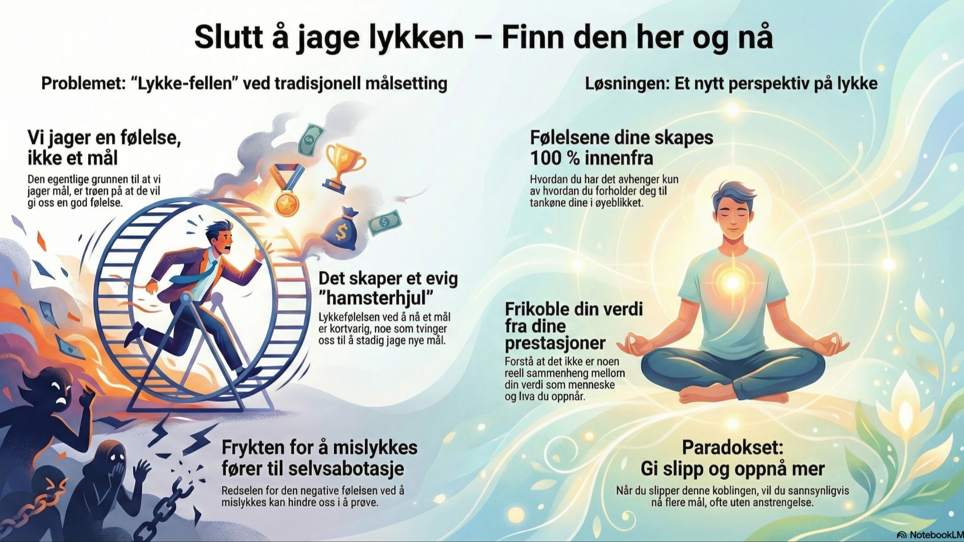 Hovedgrunnen til at vi jager mål, er at vi tror måloppnåelsen vil gi oss en god følelse. Vi tror at mer penger, bedre form eller økt anerkjennelse er veien til lykke. Men vit dette: Dine følelser – hvordan du har det – er 100 % avhengig av hvordan du forholder deg til tankene dine i øyeblikket.