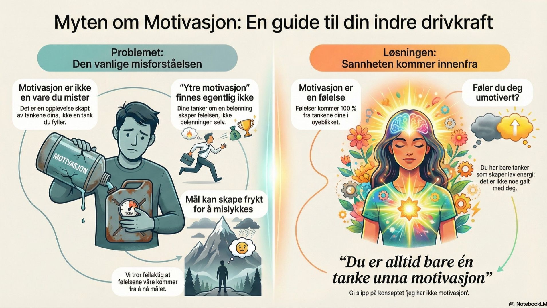 Din opplevelse, din følelse og din motivasjon er du alltid bare én tanke unna. Når du ser dette – virkelig ser det – kan du gi slipp på konseptet "Jeg har ikke motivasjon". Da oppdager du at det ikke er noe galt med deg.
