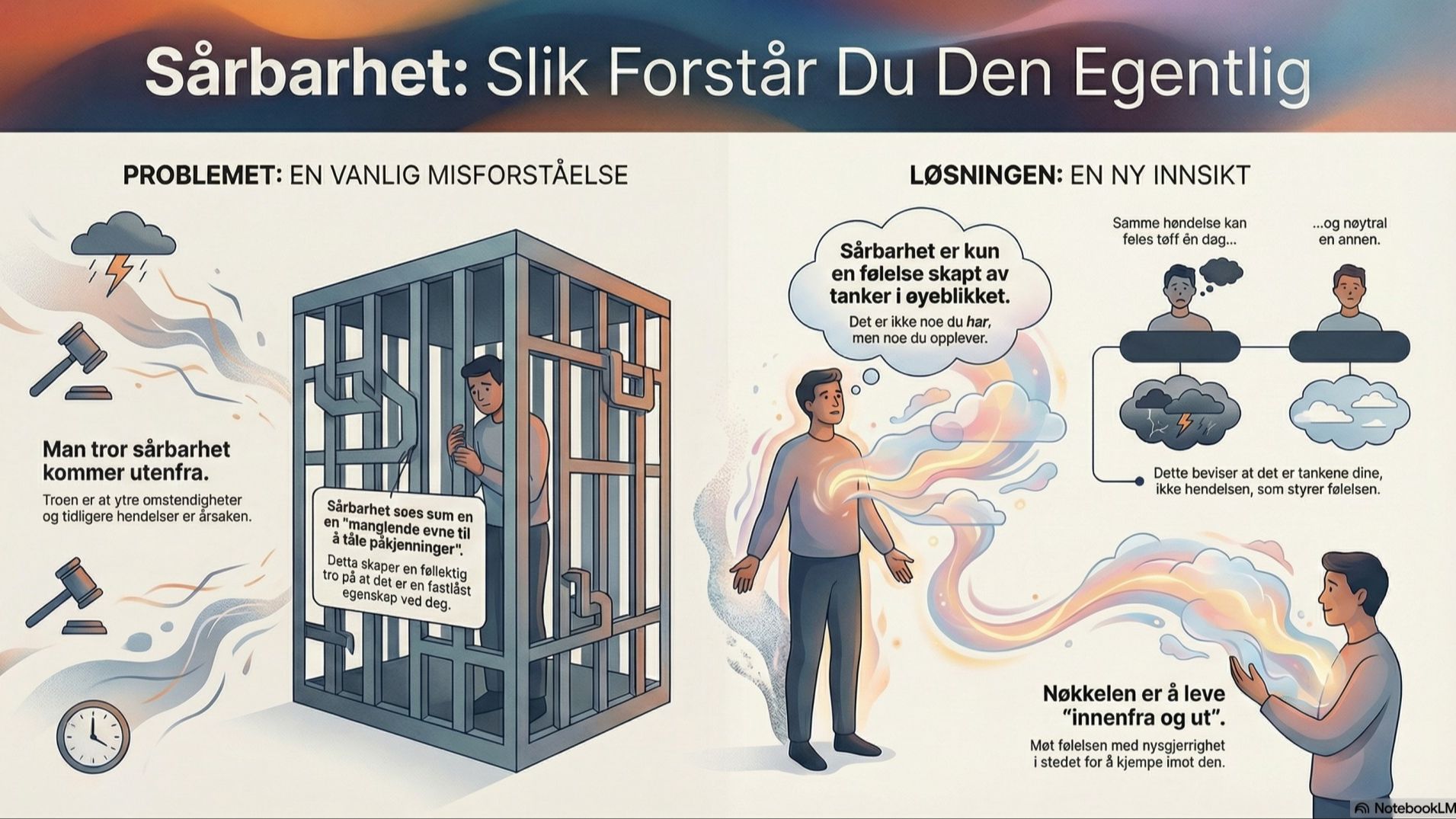 Har du lagt merke til at en ekstern hendelse kan virke tøff og hard en dag, mens den samme hendelsen virker helt nøytral en annen dag? Det beviser at det aldri er den ytre faktoren som bestemmer om du føler deg sårbar – det er kun dine tanker om hendelsen der og da.