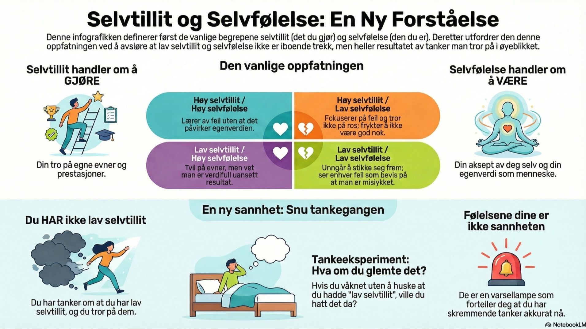 Sannheten er at selvtillit og selvfølelse ikke er noe du har eller ikke har. Det er heller ikke egenskaper som er støpt i stein. Begrepene beskriver rett og slett hvordan du forholder deg til tankene dine i øyeblikket.