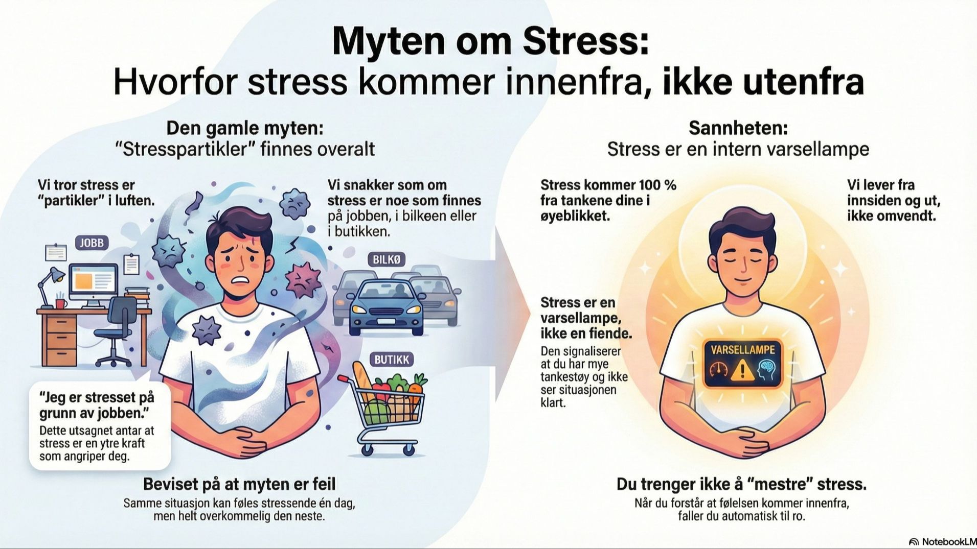 Men du trenger ikke håndtere stresspartikler som ikke finnes. Stress er en illusjon skapt av tanker i øyeblikket. Når du gjennomskuer denne illusjonen – når du ser at ubehaget kommer fra dine egne tanker og ikke fra jobben – faller du automatisk til ro.